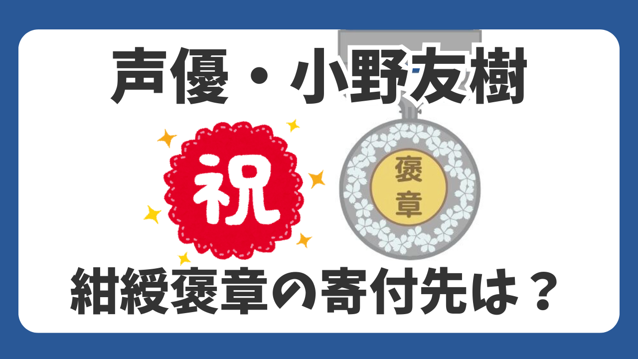 人気声優の小野友樹さんが、天皇陛下から紺綬褒章(こんじゅほうしょう)を親授されたことを報告し、大きな話題となっています。